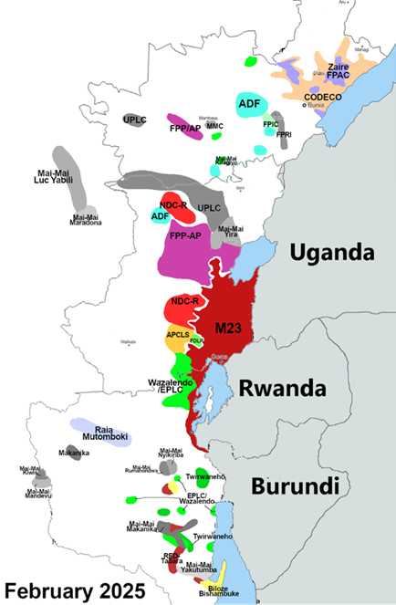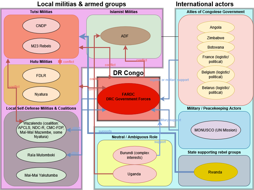Due to profound weaknesses within the Congolese army (FARDC), the government has increasingly relied on proxy warfare, notably by supporting the Wazalendo coalition—a loose alliance of armed groups formed specifically to combat M23. This strategy has heightened violence, deepened factional rivalries, and further destabilized the region. The already opaque network of armed actors is further complicated by dozens of local self-defense groups known as Mai-Mai militias. Originally formed as community defense units against external threats, these militias have evolved into diverse factions, each driven by distinct political, ethnic, or economic interests, frequently competing over territory and natural resources.