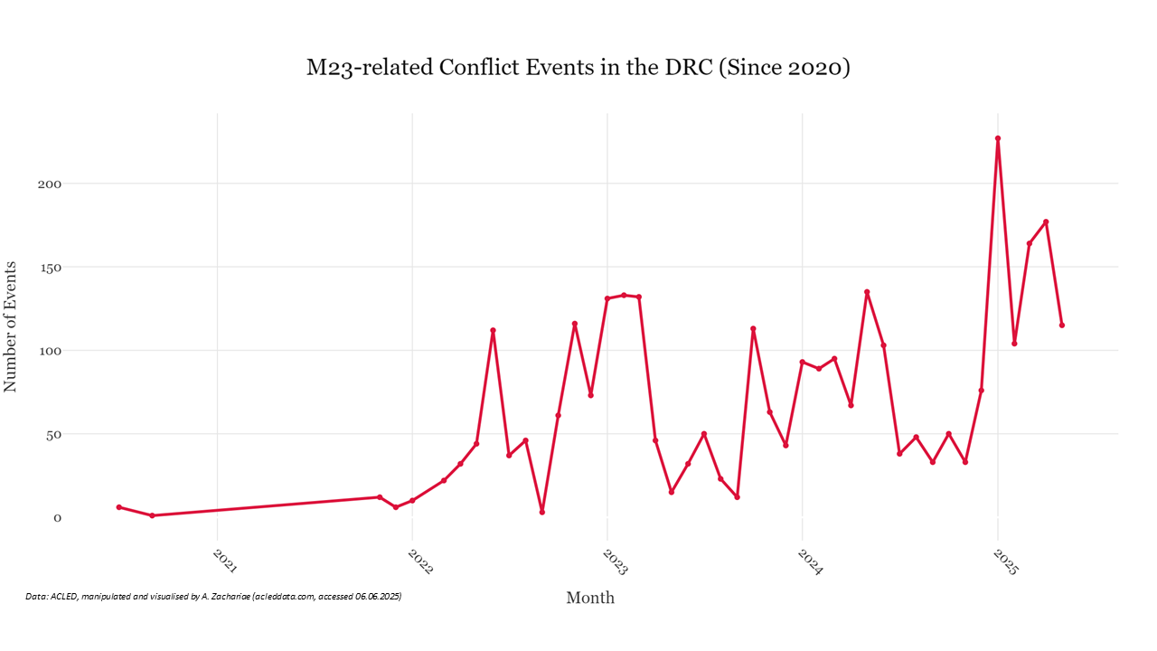 The re-emergence and escalation of M23 activity from 2022 onwards is clearly visible, with 2025 marking a new peak. This trend correlates with the group’s growing military strength and territorial ambitions.