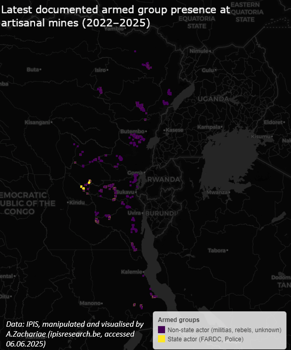 Map 4: Latest documented armed group presence at artisanal mines (2022-2025); Data Source: The International Peace Information Service (IPIS).